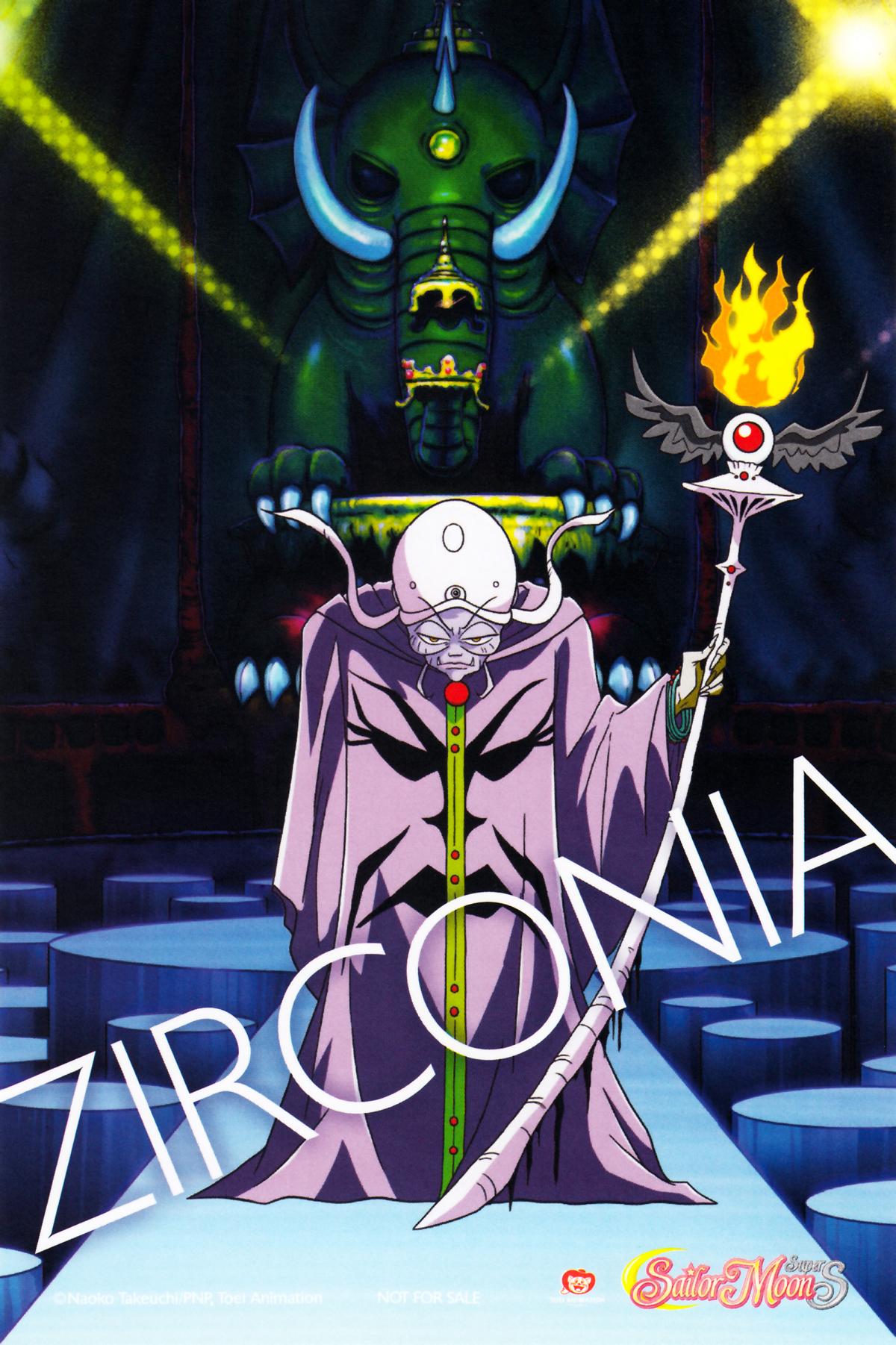 Zirkonia ist die Direktorin des Dead Moon Circus und die Vorgesetzte des Amazonen Trios und später des Amazonen Quartetts. Sie schickt ihre Zirkusartisten raus, um Pegasus einzufangen, der sich in einem Traum eines Menschen versteckt hält. Zirkonia ist die Manifestation (Erscheinungsform) von Nehelenias Alptraum alt und häßlich zu werden, und erinnert an ein Insekt (Libelle) ohne Muskelfleisch. Der Name Zirkonia leitet sich vom Mineral Zirkoniumdioxid ab, das manchmal auch als 'Zirkonia' bezeichnet wird. [Randnotizen - erster Auftritt: Episode 128 | dt. Stimme: Marianne Wischmann | jap. Stimme: Kyouda Hisako]
