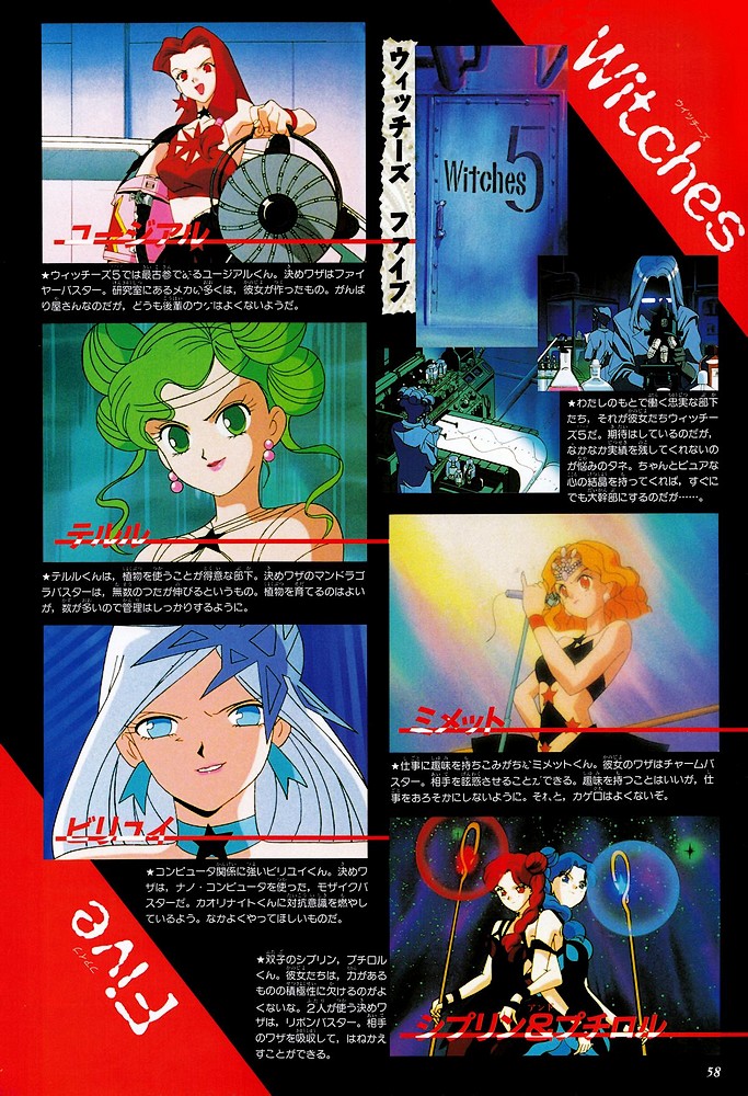- Die vorherrschenden Farben der ersten vier der Witches 5 stimmen mit denen der Inner Senshi überein, die jede als seine jeweilige Gegnerin wählte: Eugeal → Sailor Mars, Mimett → Sailor Venus, Byroit → Sailor Merkur, Telulu → Sailor Jupiter.