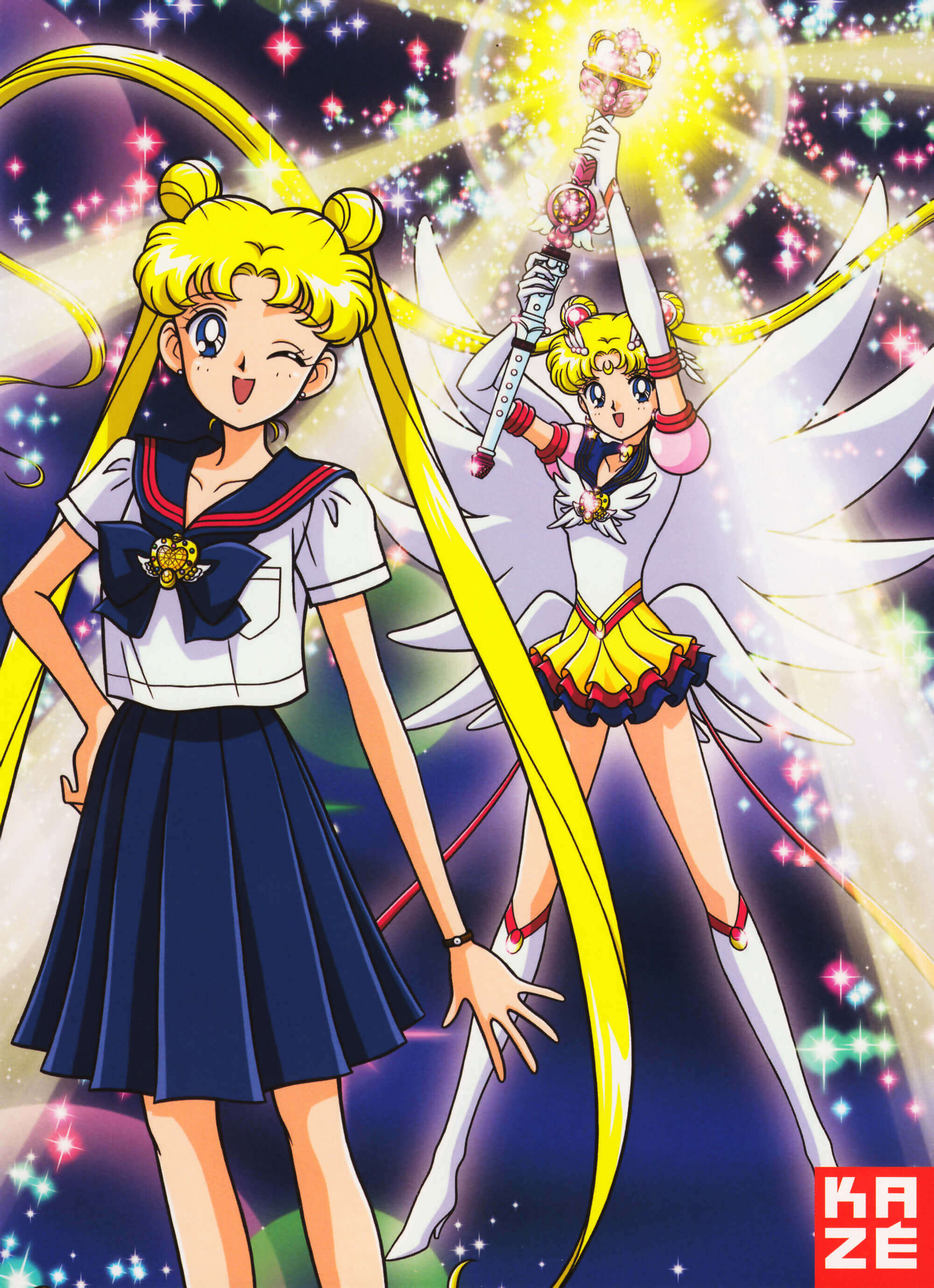 Macht des Mondlichts, mach auf! - Moon Eternal, Make Up!Diese Verwandlung in Eternal Sailor Moon sehen wir in der 5. Staffel. In der ersten Verwandlungssequenz (Episode 168) fliegen die Planetensymbole aller Sailor Senshi in die Crisis Moon Compact und in einem Lichtblitz wird diese zum Eternal Moon Article. Dann öffnet sich der Deckel und gibt den Blick auf den Kristall im Inneren frei. Super Sailor Moon streicht mit ihrer Hand über den Kristall und dieser strahlt ein helles rosa Licht aus. Federn wirbeln durch die Luft und verdecken sie für einen Moment, bis sie mit großen Engelsflügeln und einer golden leuchtenden Mondsichel auf der Stirn wieder auftaucht und die leuchtende Brosche zwischen ihren Händen hält. Sie hebt ihre Hände und die Brosche befestigt sich an ihrem Dekoltee, dann breitet sie ihre Flügel aus und wirbelt herum. In einem weiteren Federwirbel erscheint Eternal Sailor Moon und nimmt ihre Endpose ein. In der zweiten und beibehaltenen Verwandlungssequenz erscheint die Brosche (Eternal Moon Article) und der Deckel öffnet sich, wodurch der Kristall darin zum Vorschein kommt. Usagi streicht mit ihrer Hand über den Kristall und dieser strahlt ein helles rosa Licht aus. Federn wirbeln durch die Luft, während sich goldenes Licht zu einer Mondsichel auf ihrer Stirn bildet und Flügel auf ihrem Rücken erscheinen. Sie breitet ihre Arme aus und ihre neuen Flügel und ihr Body kommen zum Vorschein, dann sammeln sich weitere Federn, um daraus ihre Handschuhe zu formen. Dann dreht sie sich um und in einem weiteren Federwirbel materialisiert sich der Rest ihres Sailor-Fuku. Eternal Sailor Moon dreht sich noch einmal und ihre Flügel werden kleiner und schließlich nimmt sie ihre Endpose ein. Übrigens: Die Farben der Edelsteine auf der Brosche entsprechen den jeweiligen Senshi-Farben. Die Edelsteine auf der linken Seite stellen die Inner Senshi dar, während die auf der rechten Seite die der Outer Senshi darstellen und der rosafarbene Edelstein in der Mitte steht für Eternal Sailor Moon selbst.