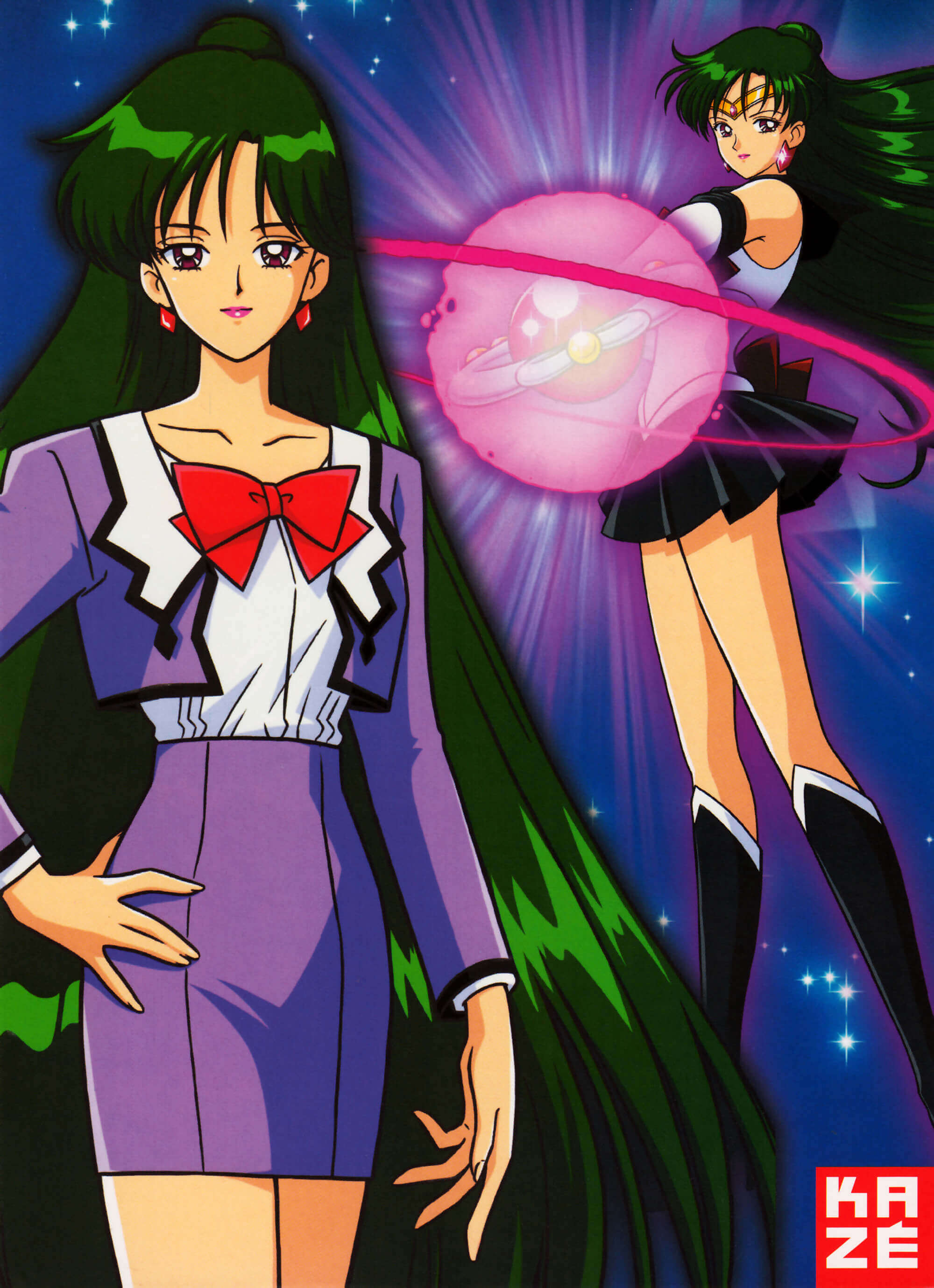 • Im Anime ist die Farbe der Aura einer Sailor Senshi meist immer die dominante Farbe ihres Fukus, aber Sailor Plutos Farbe ist manchmal schwarz und manchmal violett.