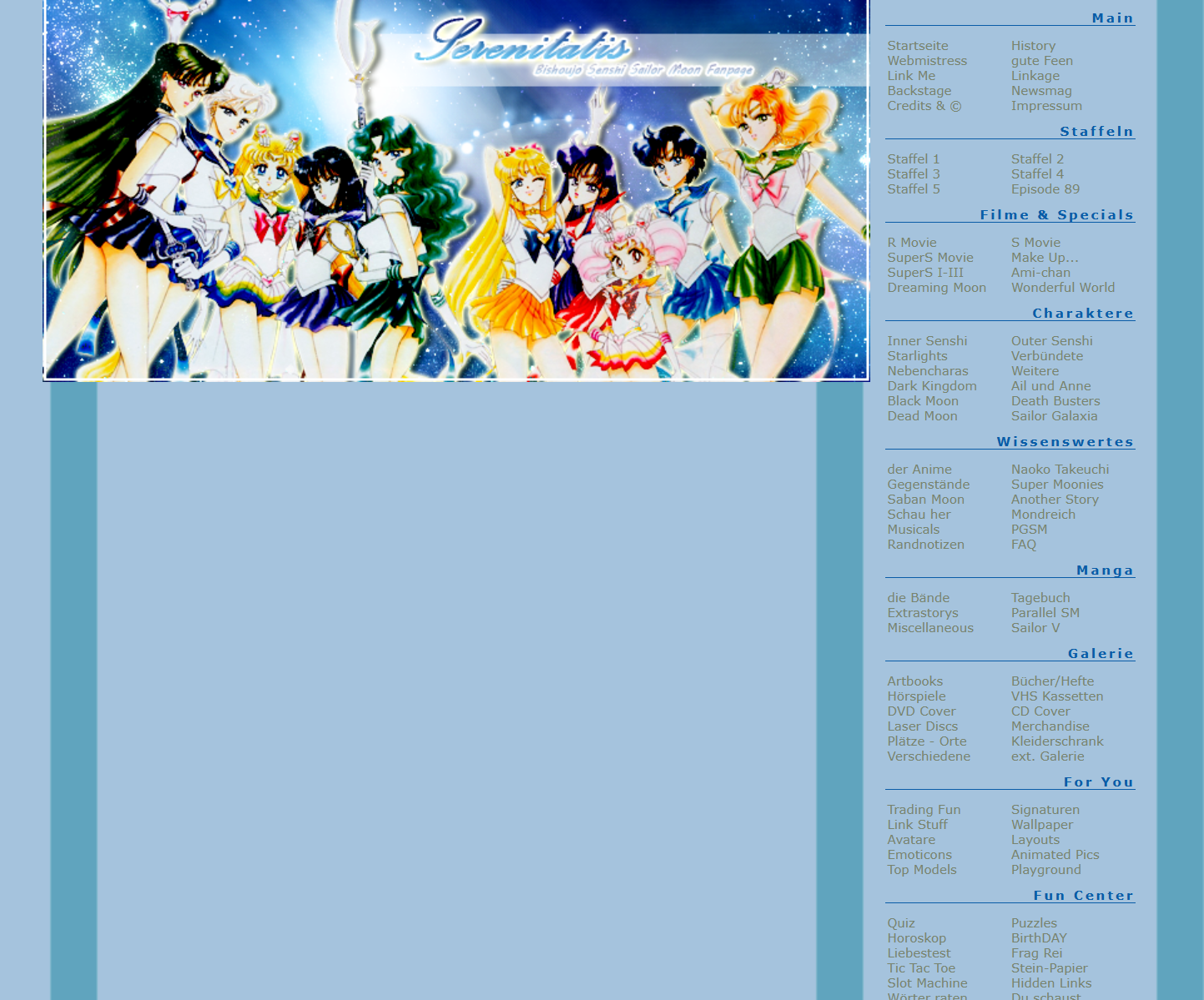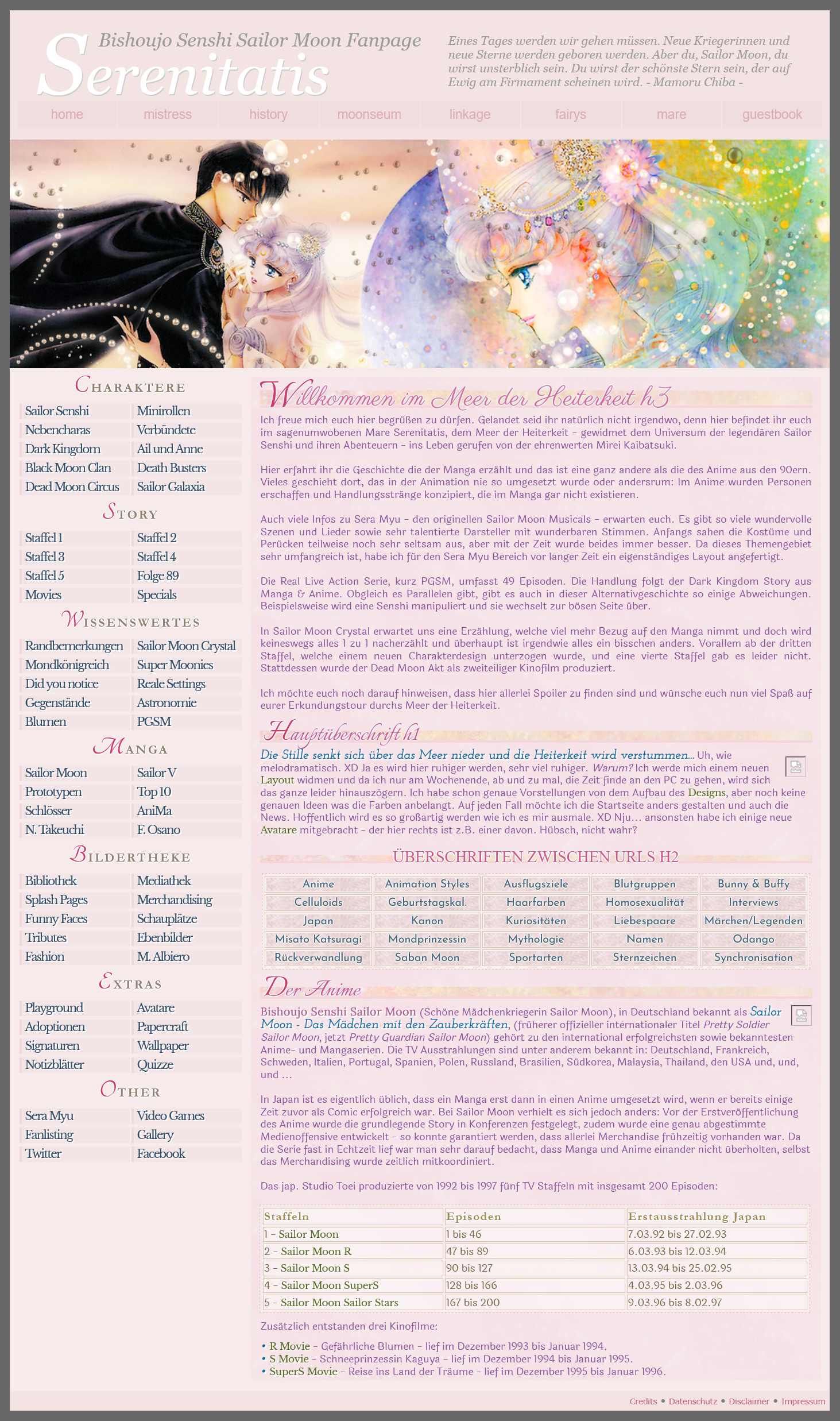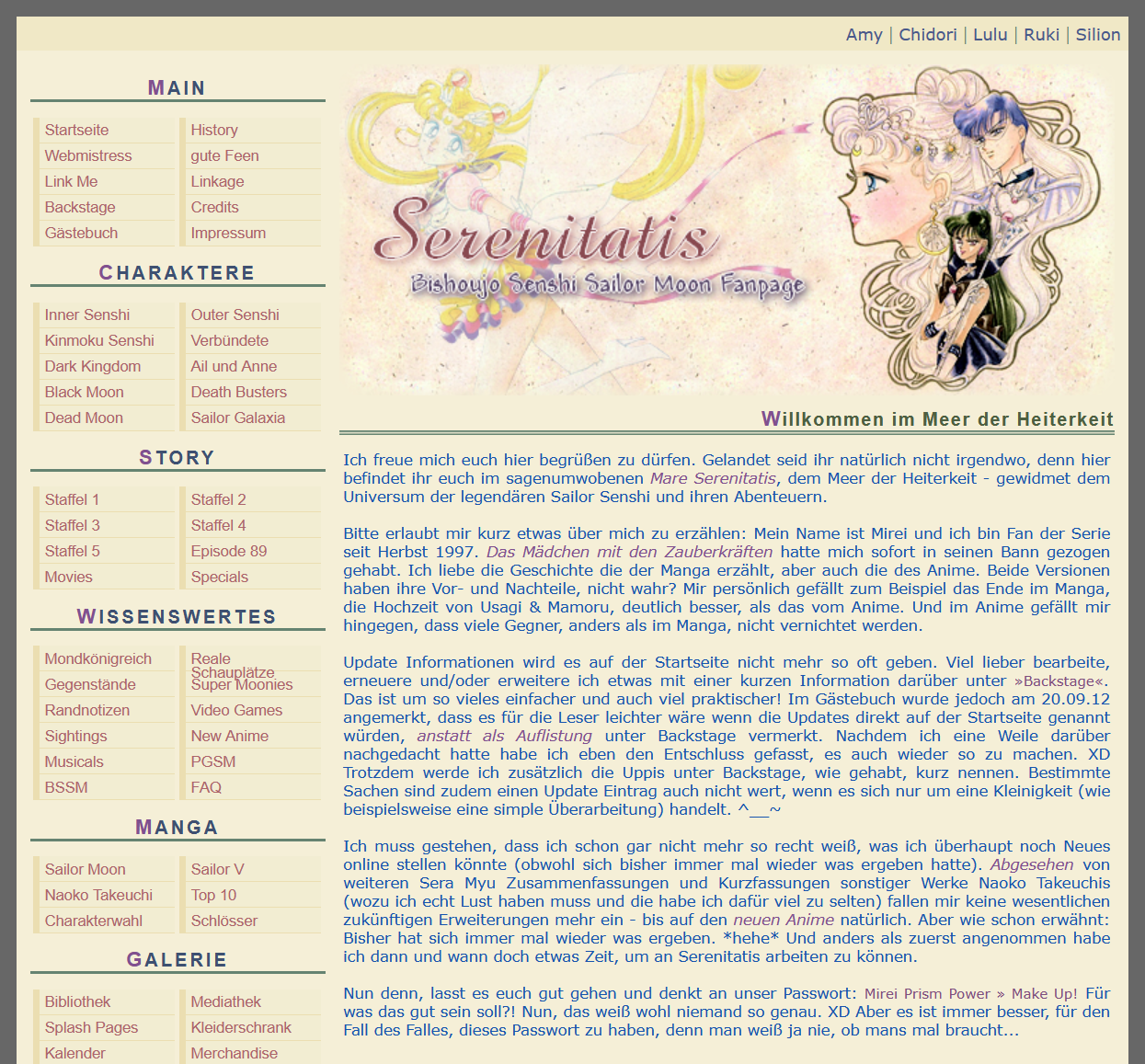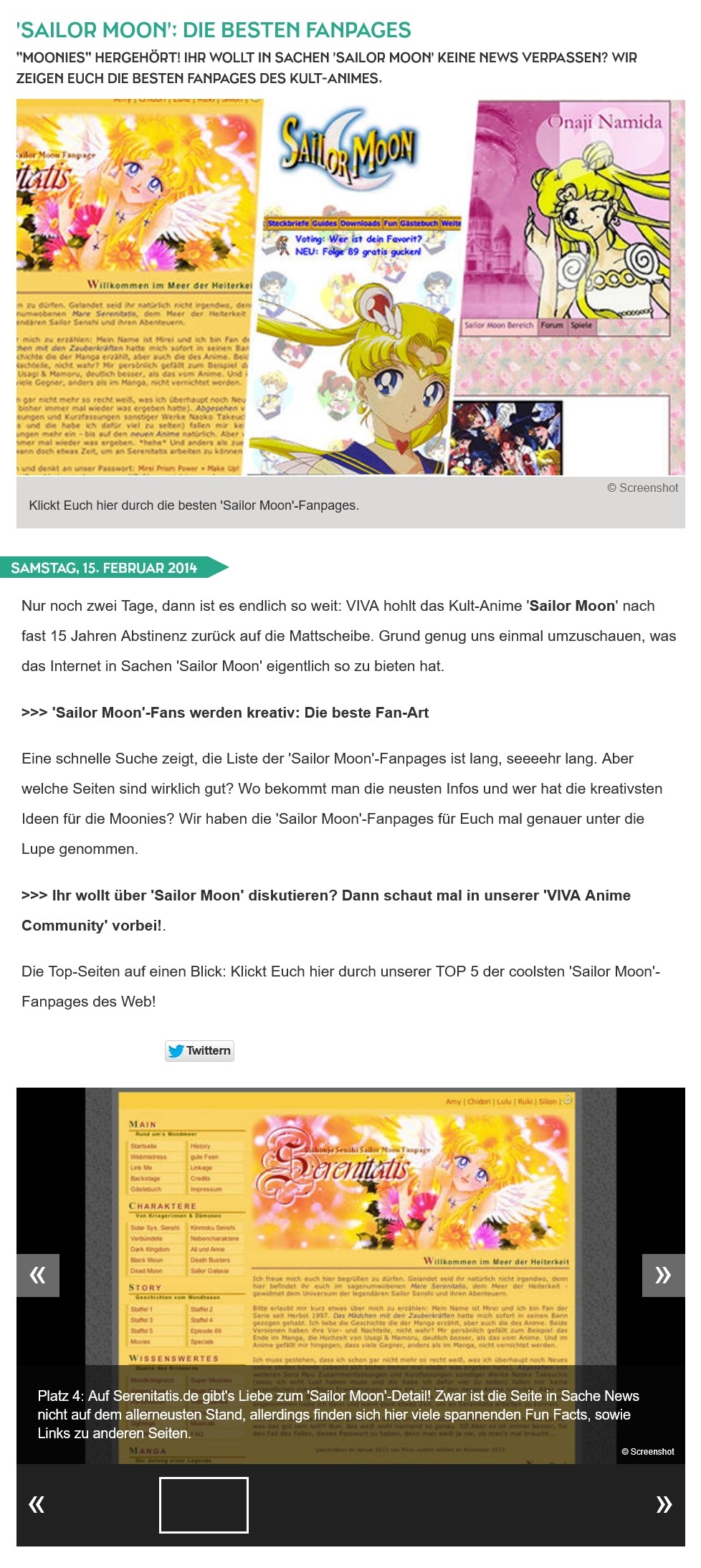 Vor etlichen Jahren erschien auf der viva.tv-Website ein Artikel mit der Überschrift 'Sailor Moon': Die besten Fanpages. Ich war sichtlich überrascht – und gleichzeitig gerührt –, als Serenitatis unter die TOP 5 gewählt wurde und auf Platz 4 landete! Auf viva.tv war zu lesen: Platz 4: Auf Serenitatis.de gibt's Liebe zum 'Sailor Moon'-Detail! Zwar ist die Seite in Sachen News nicht auf dem allerneuesten Stand, dafür finden sich hier viele spannende Fun Facts sowie Links zu anderen Seiten.