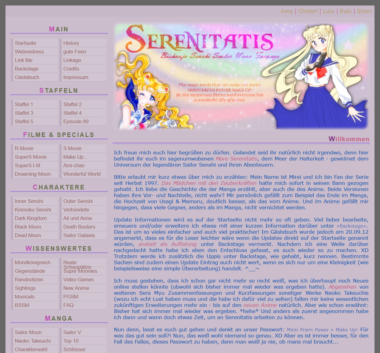 Im Jahr 2022 wurde Serenitatis neben anderen tollen Websites, darunter auch die meiner lieben Mina-chan, in einem Video der YouTuberin SailorCat erwähnt. Für mich war das ein ganz besonderer Moment und eine wunderbare Bestätigung für all die Liebe, die in dieser Seite steckt. Vielen Dank an SailorCat fürs Vorstellen und an alle, die dadurch den Weg zu Serenitatis gefunden haben! 💕