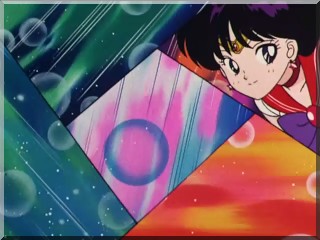 Reis Großvater eröffnet ein Fitness-Studio. Doch leider ist genau dieses Gebäude einer der Ursprungspunkte von Neo Crystal Tokyo. Kermesite - diesmal mit Dämon - kümmert sich darum. Sailor Moon besiegt den Dämon, doch dann gibt Kermesite ihr Saures. Sie macht selbst Rei Schwierigkeiten, doch da findet Rei die Kraft zu einem Power-Up und besiegt Kermesite mit ihrem neuen Burning Mandala. Kermesite bleibt nur die rasche Flucht. |