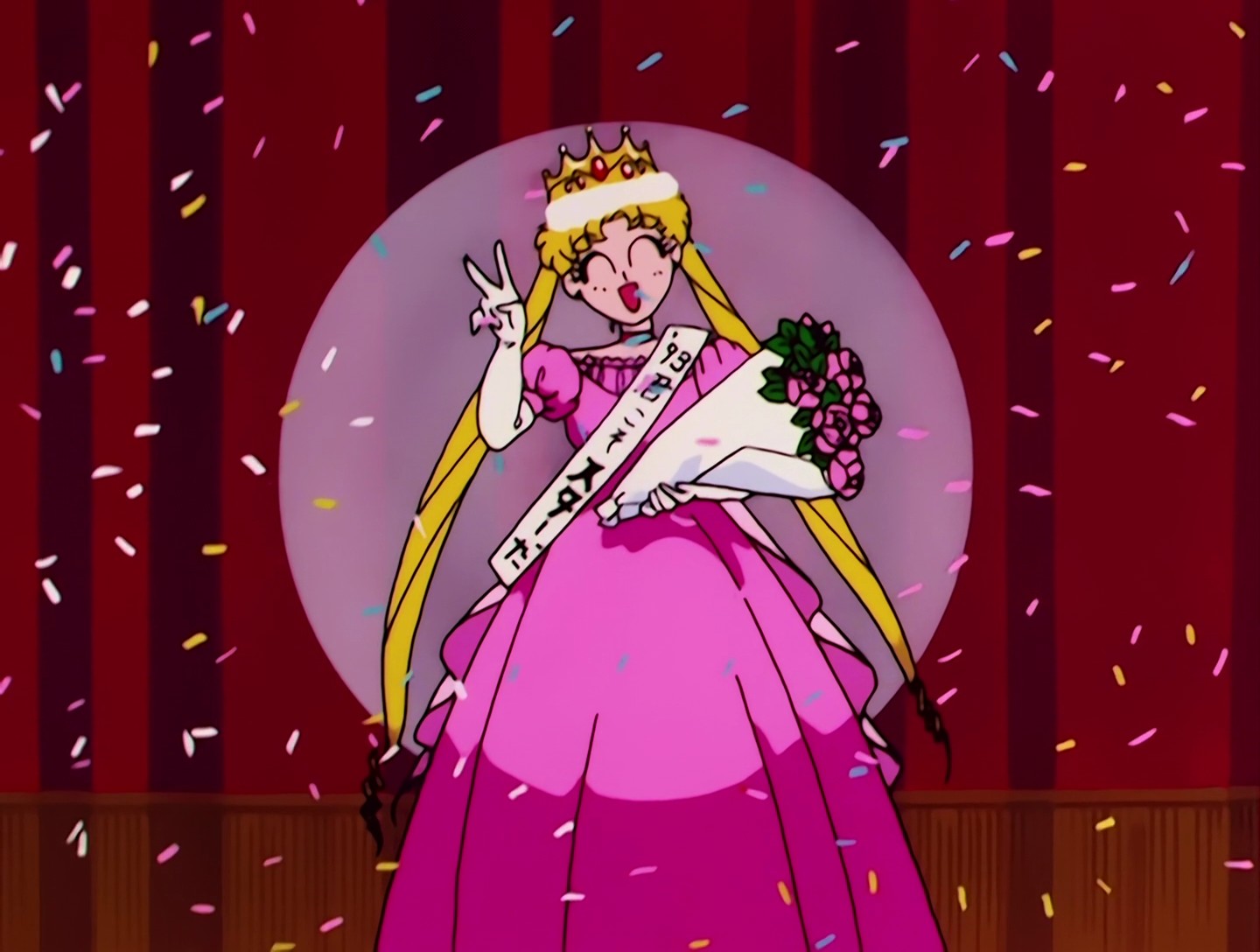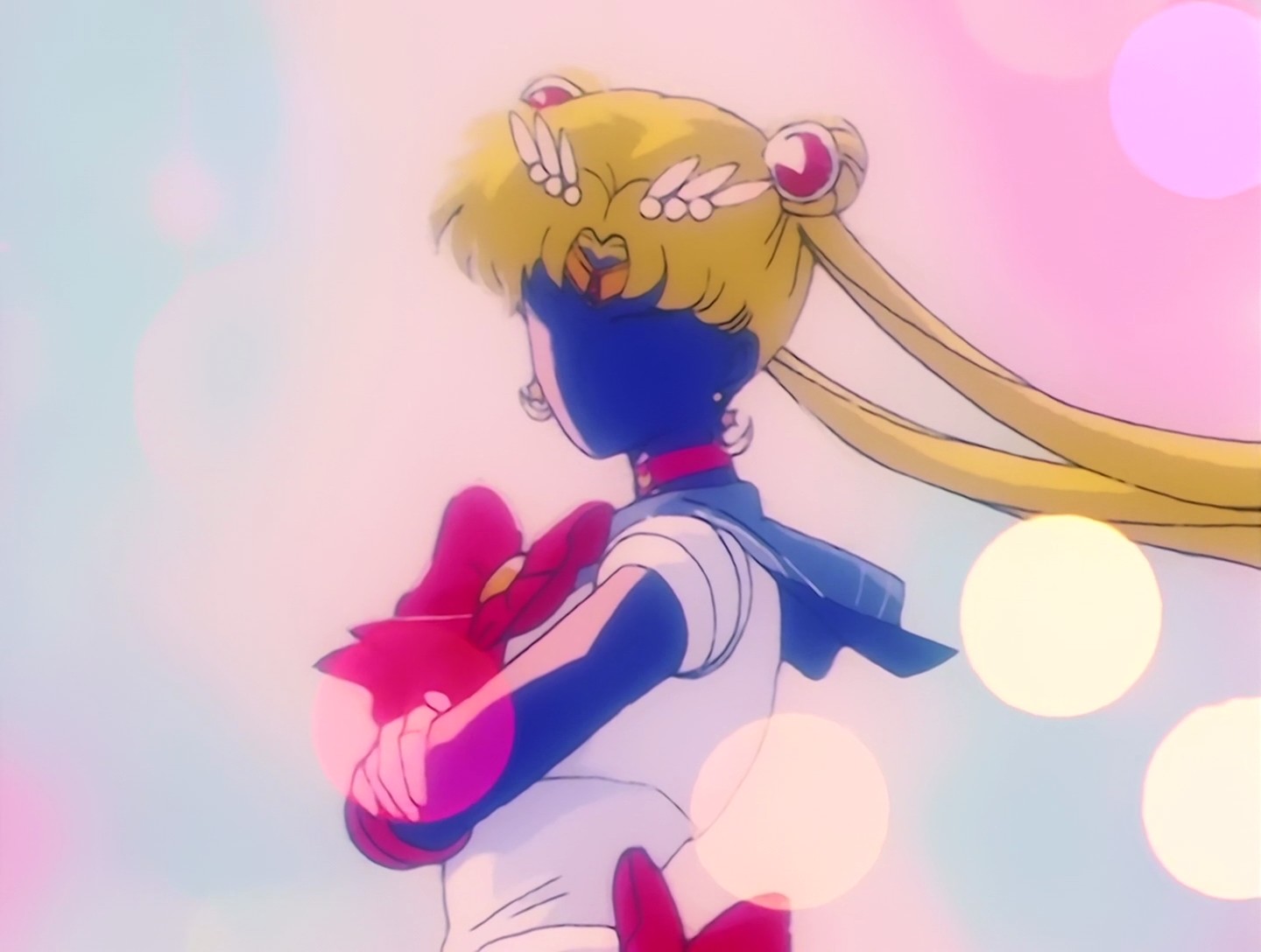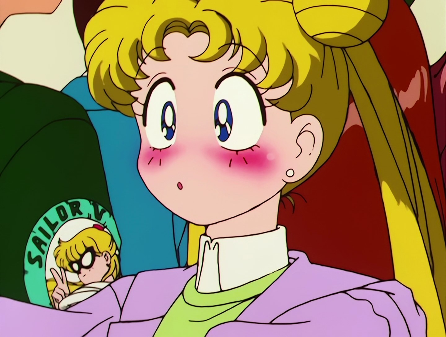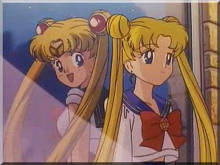 Hier trägt Sailor Moon den weißen Haarschmuck, den sie im Anime jedoch nur als Super und Eternal Sailor Moon trägt. Vielleicht hat der Zeichner beim Zeichnen gerade an den Manga denken müssen. XD