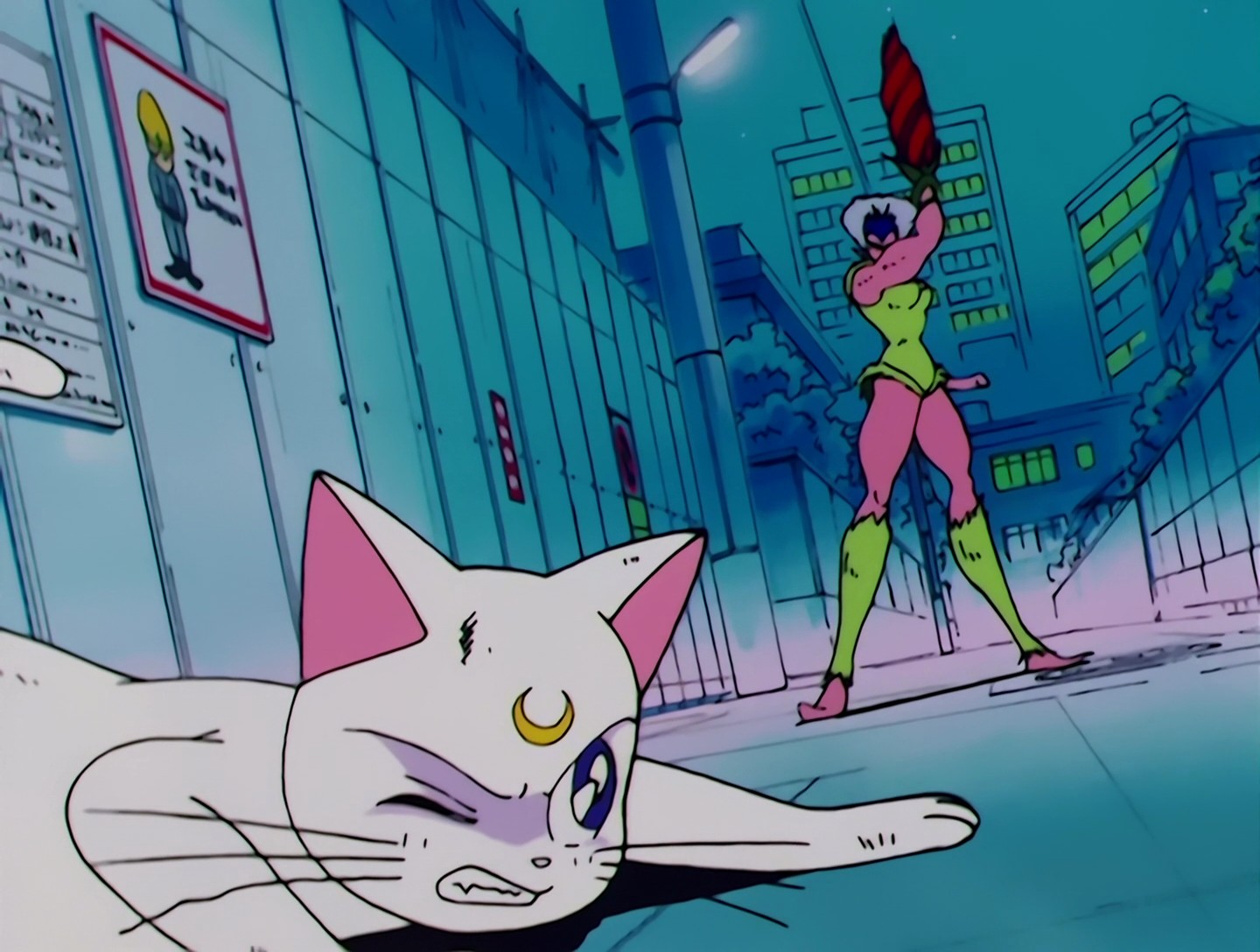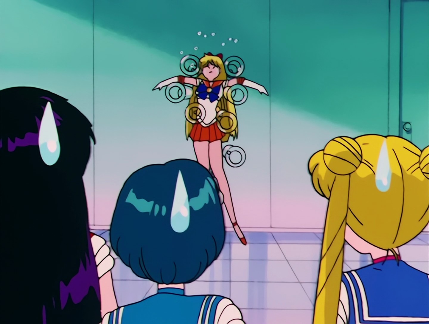 In der Regel verschwinden Waffen und Gegenstände der Gegner nach ihrem Tod. Das ist in dieser Folge nicht der Fall – nach dem Tod des Pharmakon-Droiden ist Sailor Venus immer noch mit der Waffe des Droiden an die Wand genagelt. XD