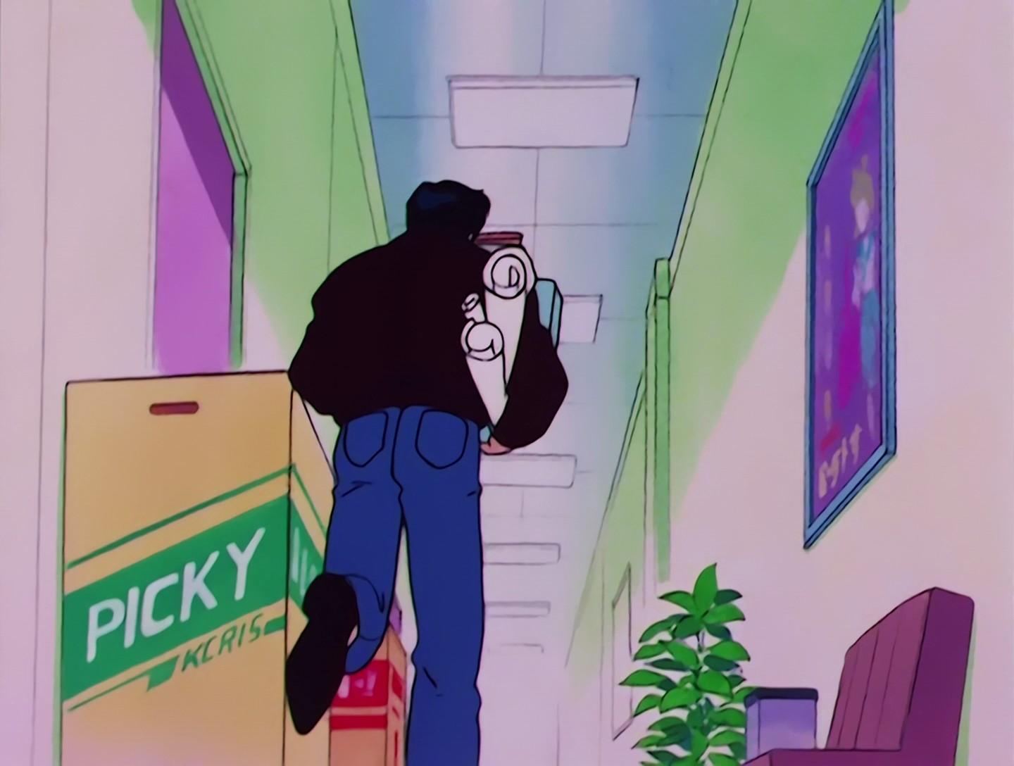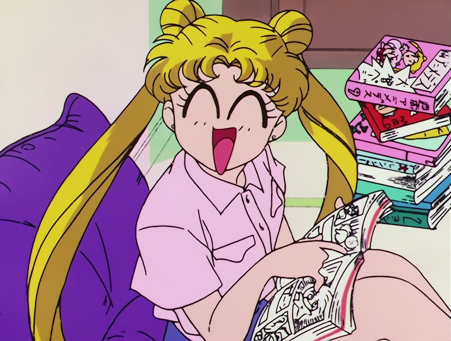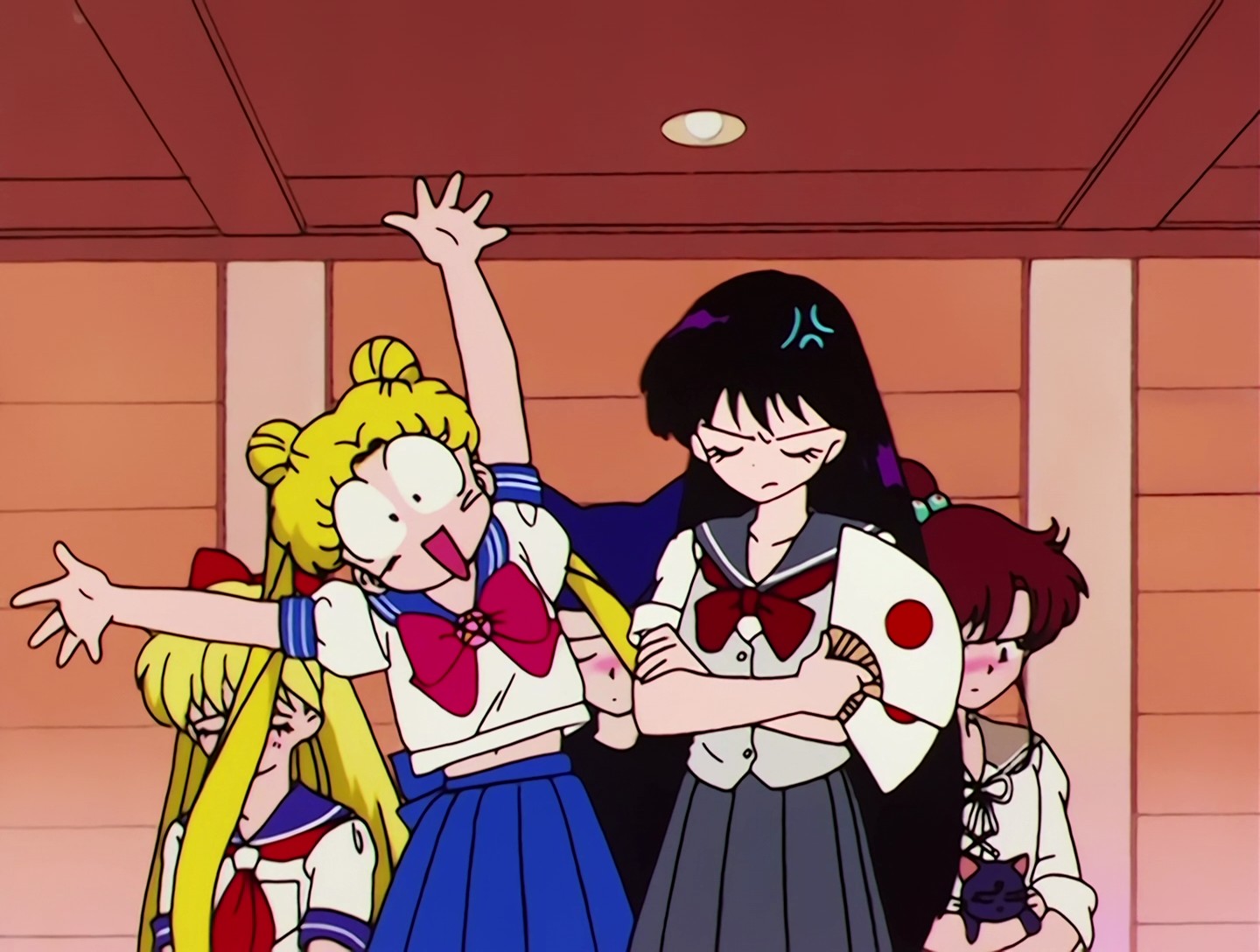 Chibiusa trägt die Wäsche (und Hauschuhe mit Hasen im Naoko-Stil), daher tritt sie die Tür mit ihrem Fuß auf und verletzt dabei versehentlich den armen Artemis. ^.^"