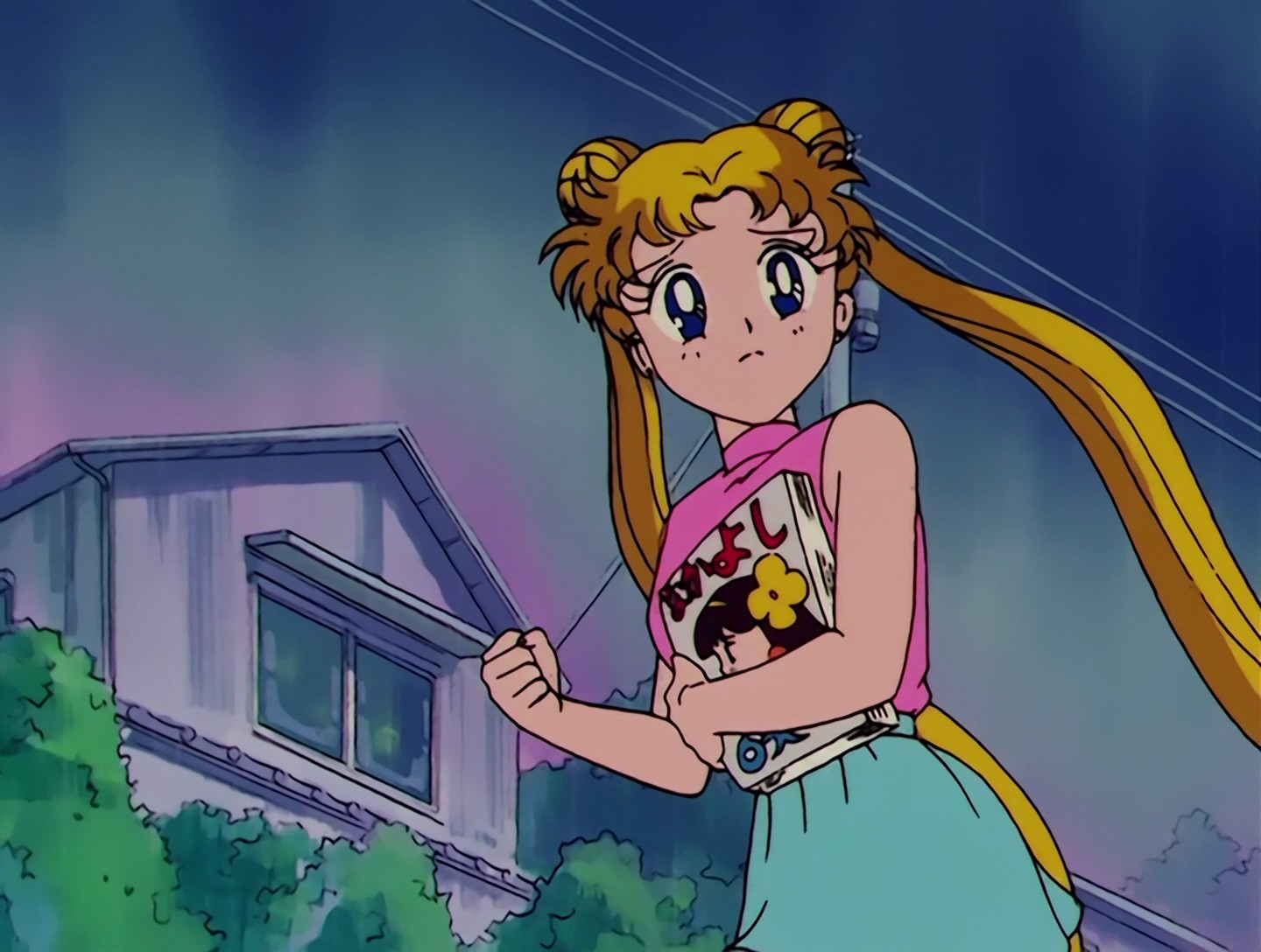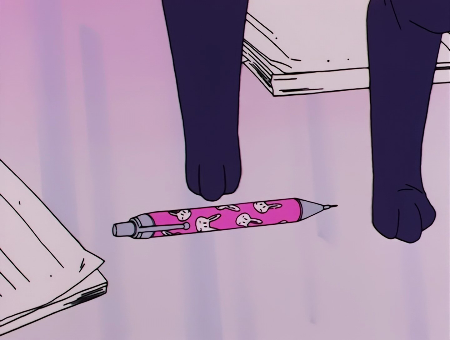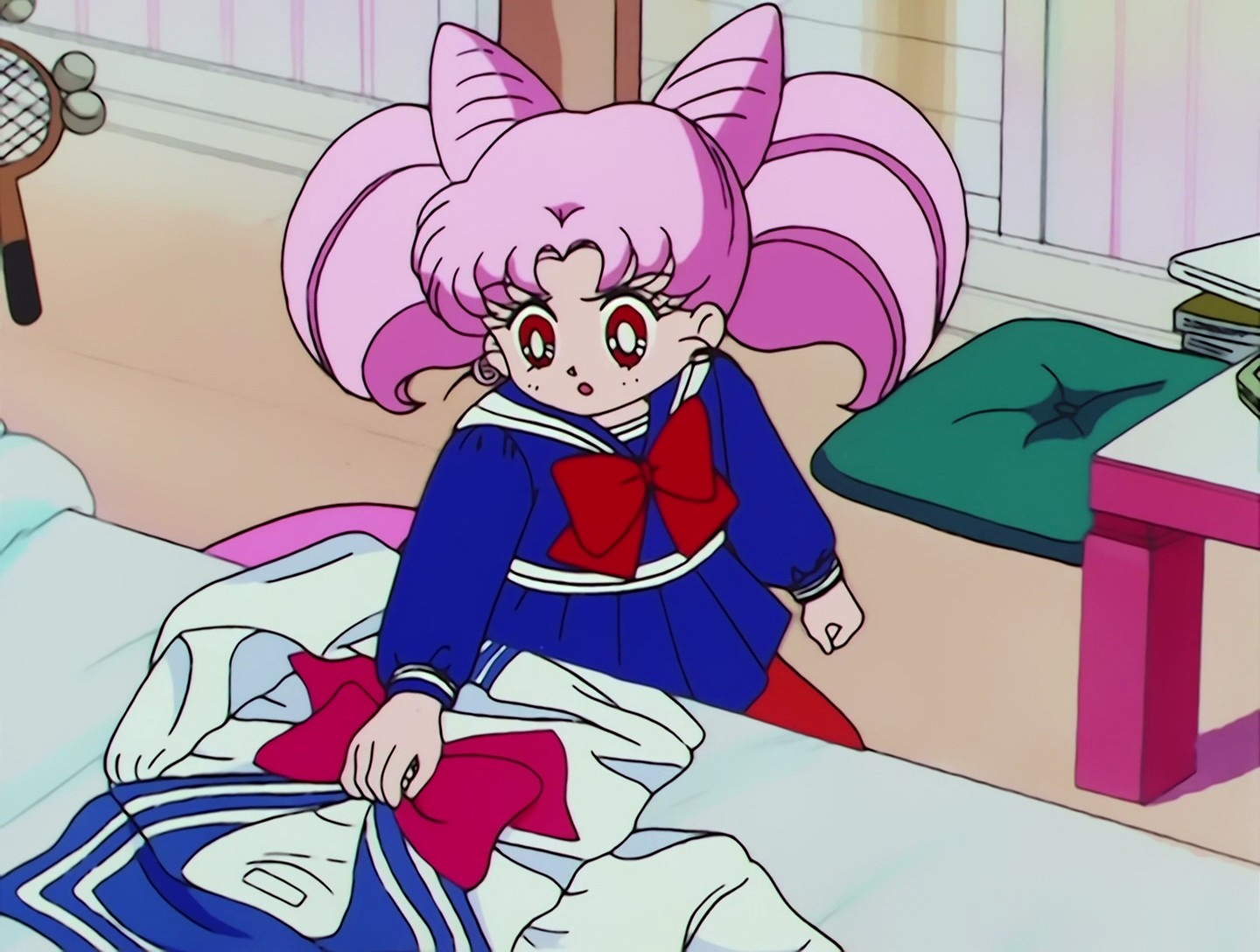Chibiusa geht in Usagis Zimmer, sie trägt süße Häschenhausschuhe und geht zu Usagis Schuluniform. In dieser Einstellung ist der Innenbereich des Oberteils blau, in der nächsten Einstellung weiß.