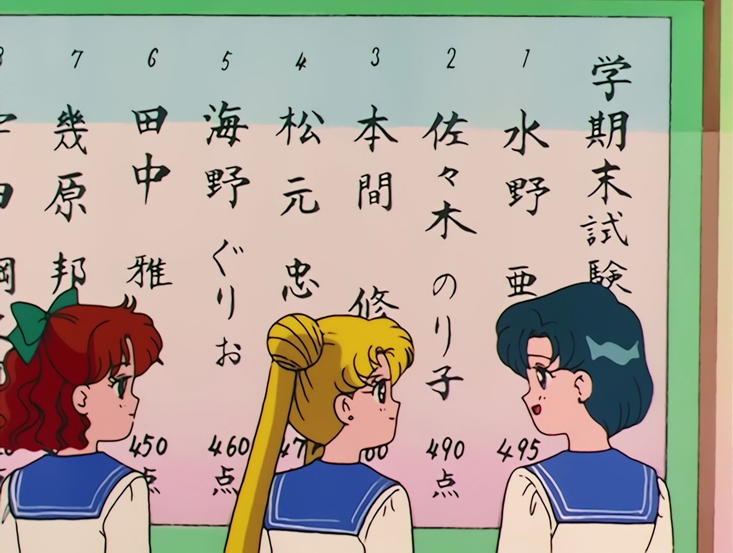 Interessant ist die Liste der Namen der Prüfungssieger. An erster Stelle steht natürlich Ami Mizuno. ^_^ Auf Platz 2 steht Noriko Sasaaki (ein Hinweis auf Noriyo Sasaki, eine der Regisseure, welche an Staffel 2 bis 5 gearbeitet hat). Auf Platz 7 Kuni Ikuhara (Kunihiko Ikuhara ist Regisseur von Staffel 2 bis 4). Gurio Umino belegt den 5. Platz.