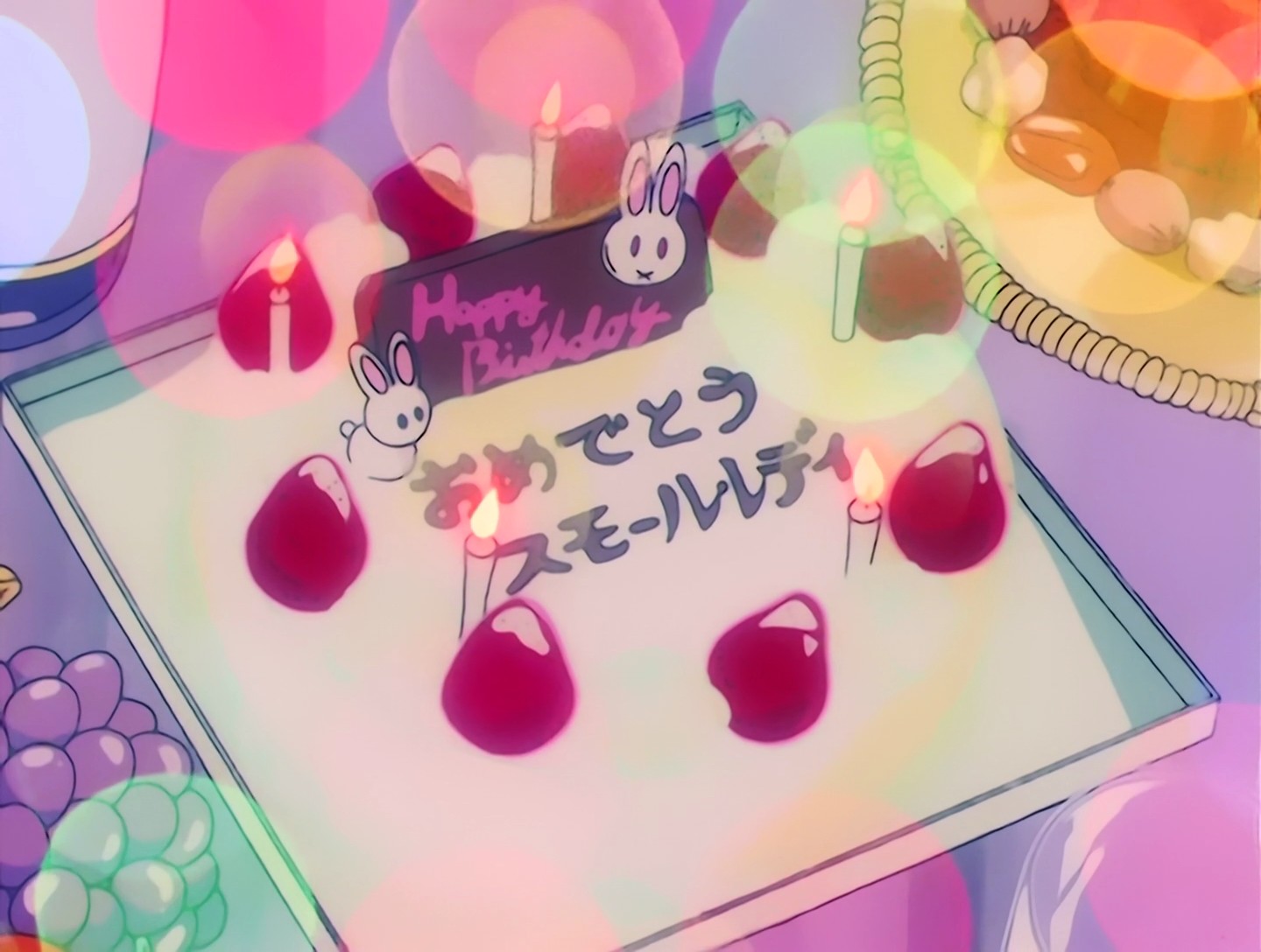 Die Geburtstagstorte der kleinen Lady ist mit fünf Kerzen geschmückt, was ihren fünften Geburtstag symbolisiert. Natürlich dürfen auch Häschen nicht fehlen, die die Torte zieren. ^.^