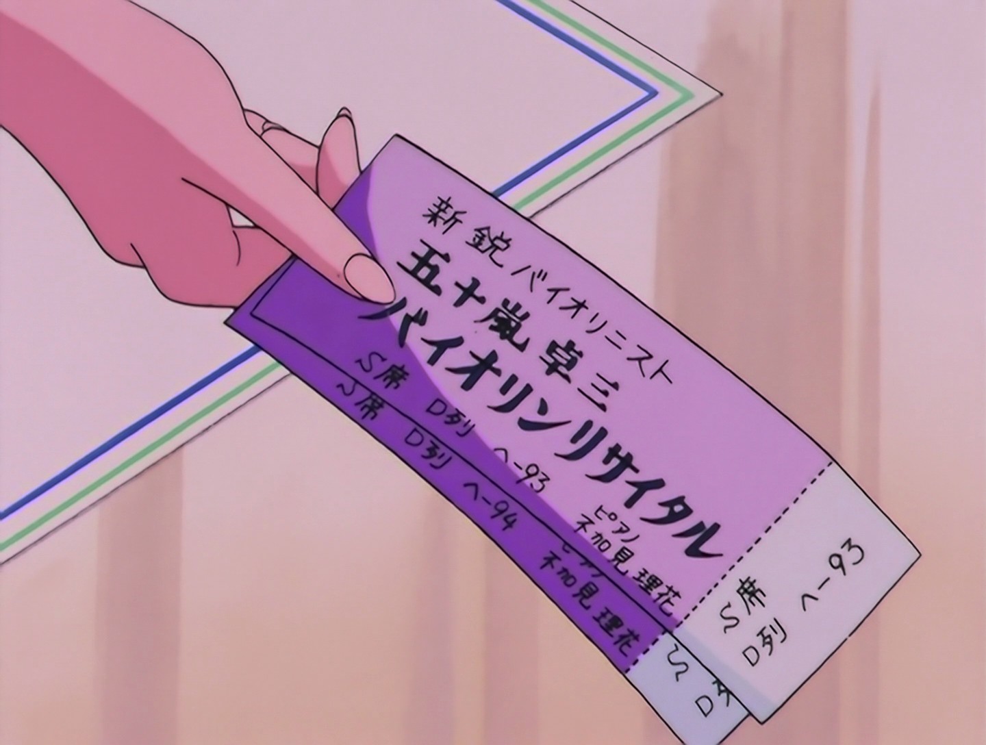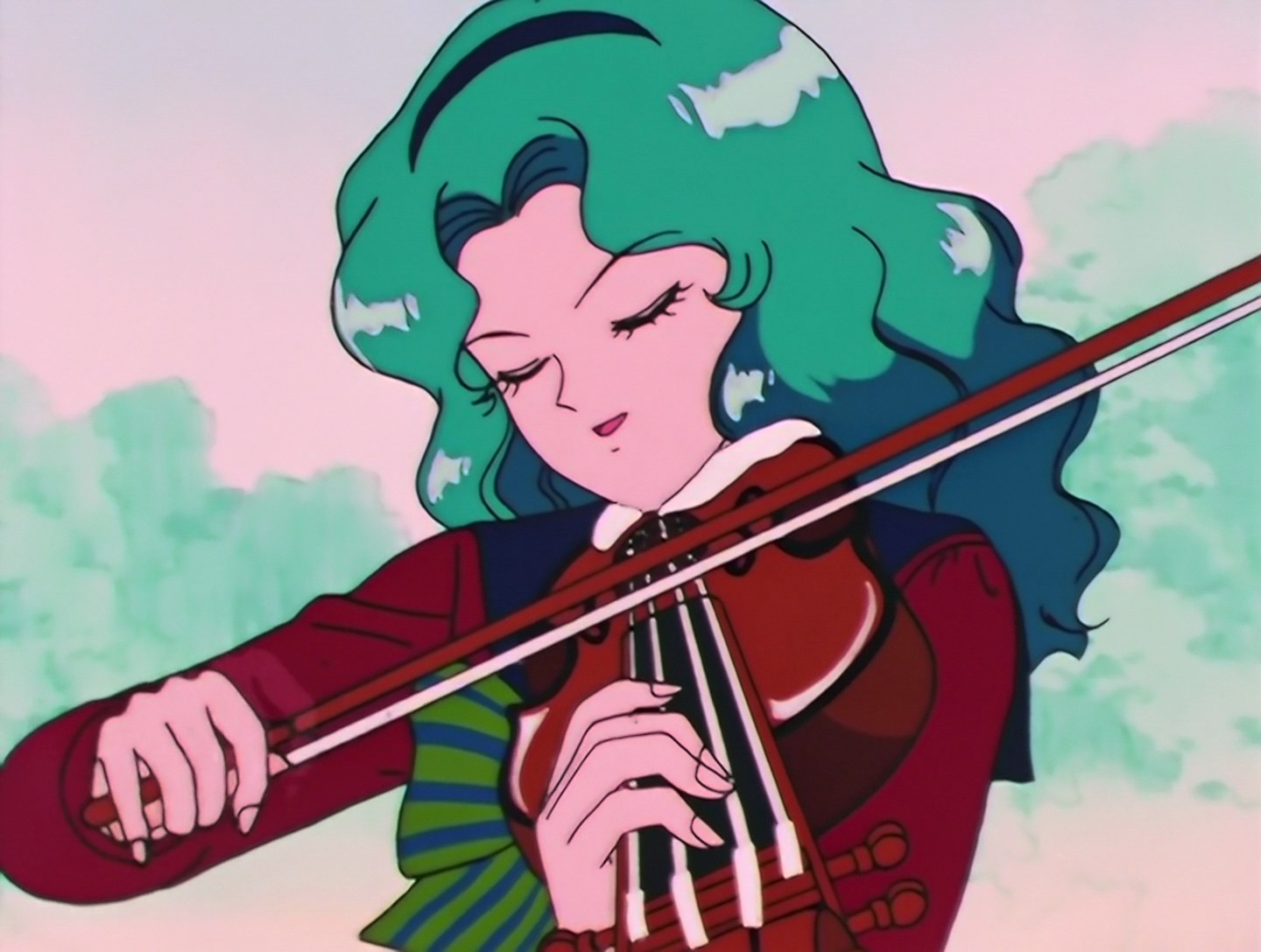 Bunny bringt Mamoru verbrannte Plätzchen und ist traurig, dass sie nichts richtig kann. Später trifft sie Michiru, die noch nicht weiß, was sie später mal werden will, weil sie so viele Talente hat. Bunny weiß das auch nicht, aber wiederum deshalb, weil sie eigentlich gar nichts kann. Michiru gibt ihr zum Trost 2 Konzertkarten. Bunny geht mit Mamoru (diesmal im weißen Smoking!) hin und trifft dort auch ihre Freundinnen. Der Geigenspieler wird dann von einem Daimon angegriffen, aber den Senshi können ihn gemeinsam besiegen, obwohl Sailor Neptun und Uranus eine Kooperation mit den inneren Senshi ablehnen. Für sie zählt nur ihre Mission, die 3 Talismane zu finden. |