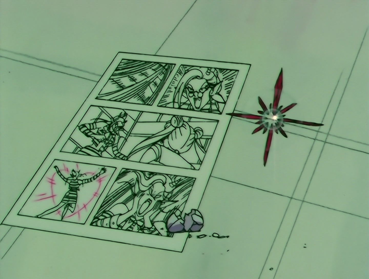 Die Bilder auf dem Mangablatt, in das der Daimon Uhenshu eingearbeitet wurde, sind nicht uninteressant: Sie zeigen den Kampf des Daimon mit Sailor Moon und seinen anschließenden Tod durch den Angriff von Rainbow Moon Heartache.