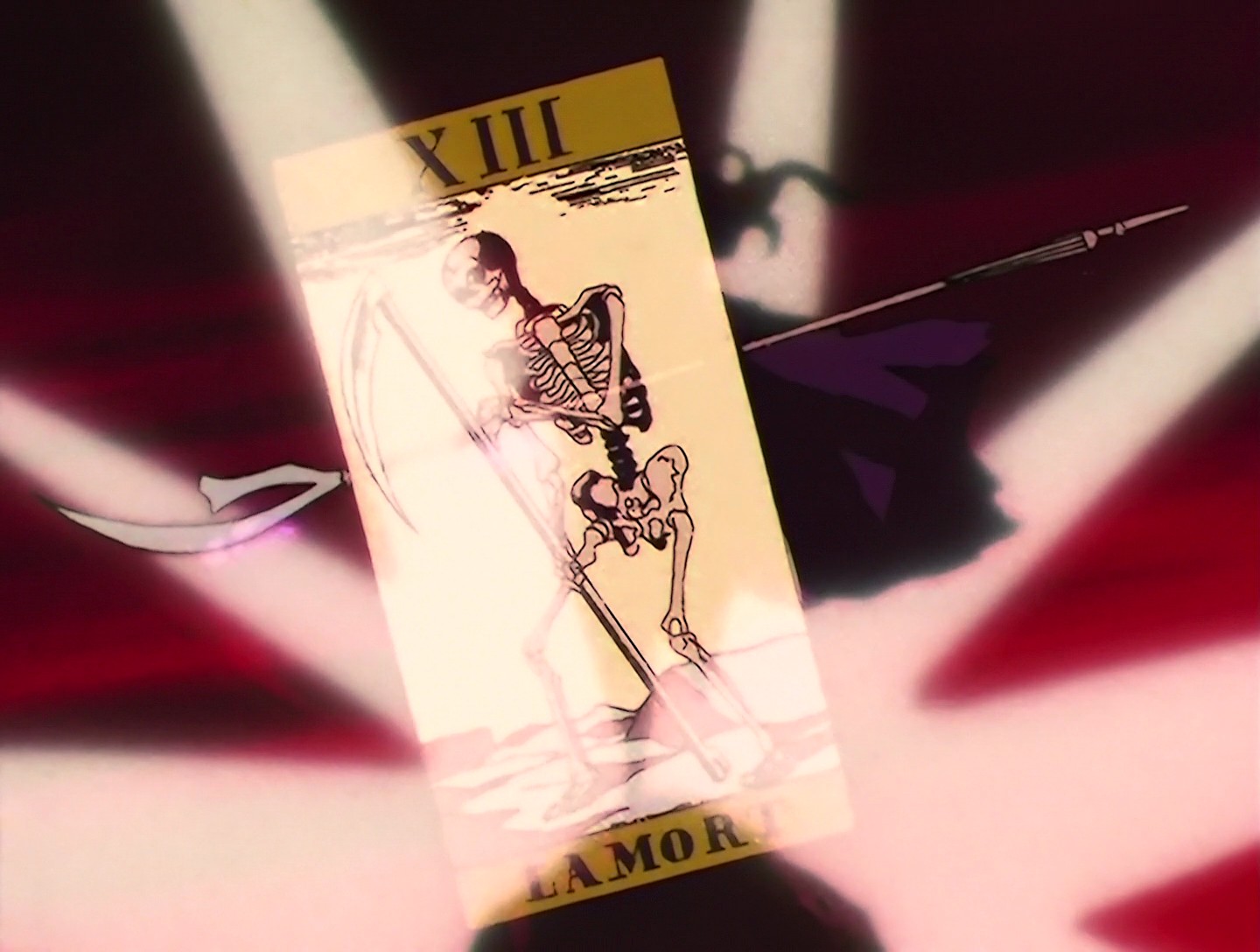 Die Tarotkarte, die den Messias der Zerstörung darstellt, zeigt ein Skelett mit der Sense des Schweigens. Oben auf der Karte steht die Zahl XIII, die laut Kabbalisten Tod und Unglück symbolisiert, und unten steht das Wort „La mort“, was auf Latein „Tod“ bedeutet.