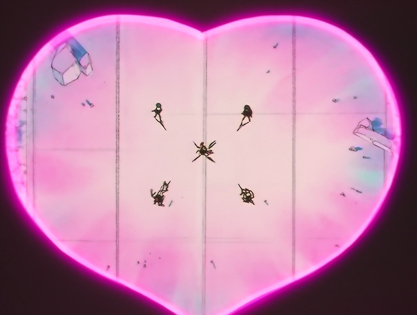 In dieser Episode wird Moon Spiral Heart Attack als wachsendes rosafarbenes Herz dargestellt, das Sailor Moon umgibt und Daimons in seiner Reichweite verdrängt, während es sich ausdehnt.