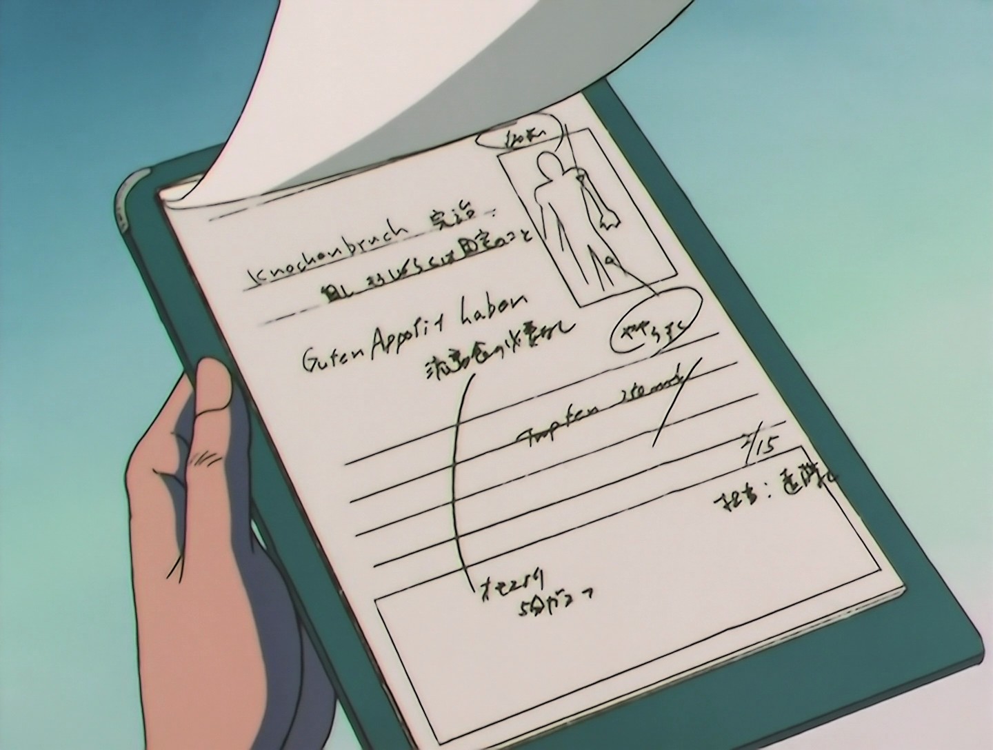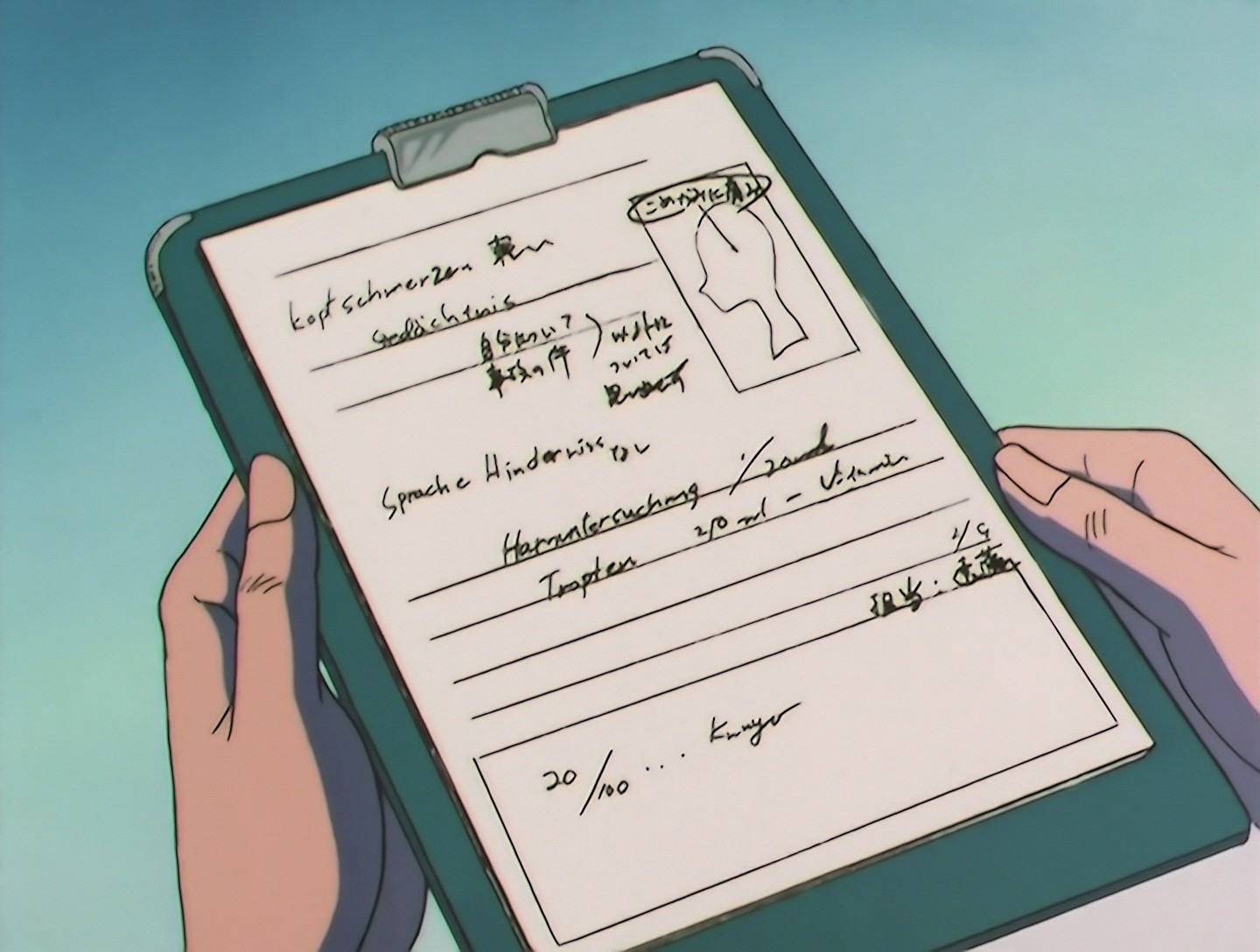 Als der Arzt sich Professor Tomoes Krankenakte ansieht, ist die Schrift darauf eine Mischung aus Japanisch und Deutsch, darunter Informationen wie Kopfschmerzen, Gedächtnis, Sprache Hindernisse, Harnuntersuchung, Tropfen, Knochenbruch und Guten Appetit haben. Bild 2